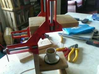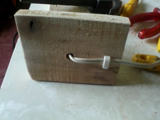 En la tabla más pequeña hacemos un agujero con taladro y broca de 10 y pasamos el cable gemelo. Una tapa de metal de algún frasco servirá de base para el portalámparas. Esta tapa va fijada a la base de madera.