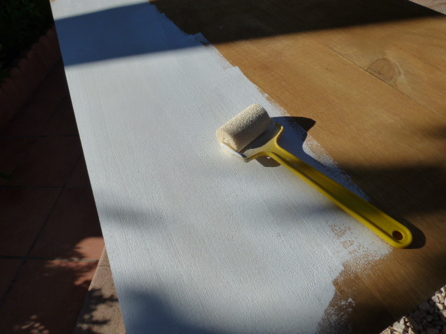 Cuando probé el tablero sobre las patas color nogal, ví que no me gustaba tanto contraste, así que le he dado a las patas, Chalky blanca muy aguada, a modo de pátina. Nada más pasar la brocha con la pintura aguada, he ido retirandola con un paño húmedo.