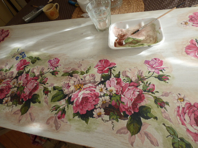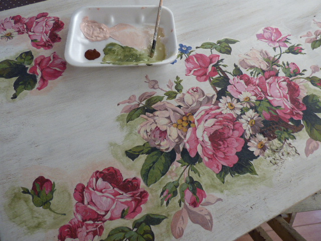 Las esquinas quedaban demasiado vacias, así que como el papel lleva rosas sueltas (aparte del motivo central) he ido poniendo esas rosas con hojas verdes en las 2 esquinas.