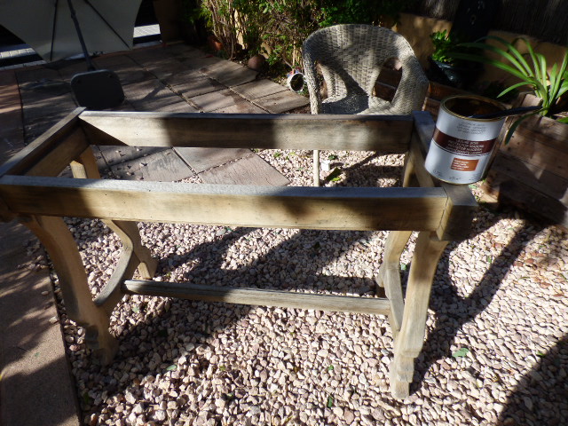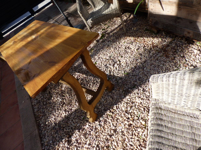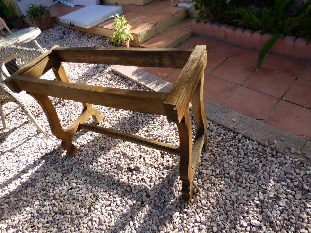 Tanto a las patas como al nuevo tablero de pino, les he dado lasur color nogal. A las patas creo que 4 o 5 manos....estaba tan reseca la madera que se lo tragaba como por arte de magia....