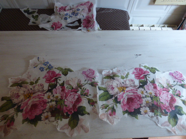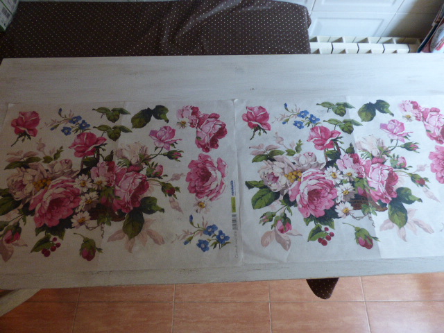 He usado 2 hojas, rasgando los motivos con las manos. Para que no se notara tanto que son dos hojas idénticas, he quitado en una de las dos, algún que otro motivo
