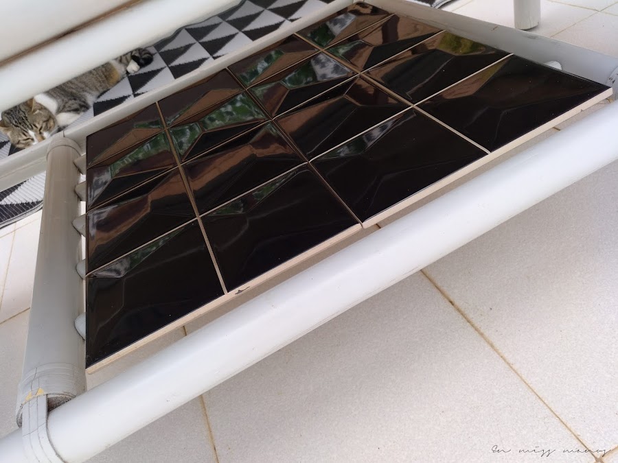 En la parte de abajo, la mesa tenía un corte que le hice el verano pasado para colocar el palo de la sombrilla, pero como este verano he colocado un toldo para poder tener más sombra, lo que hice para disimular fue ponerle dos azulejos negros, que también rescaté hace años del contenedor, y no me compliqué más.