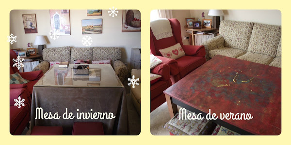 Ahora tenemos mesa de invierno, con faldilla y radiador, en la que nos encanta meternos los días de frío (a pesar de la calefacción, que ya sí tenemos jaja); y mesa de verano, sin vestir y un poquito más baja para acceder desde los sofás.