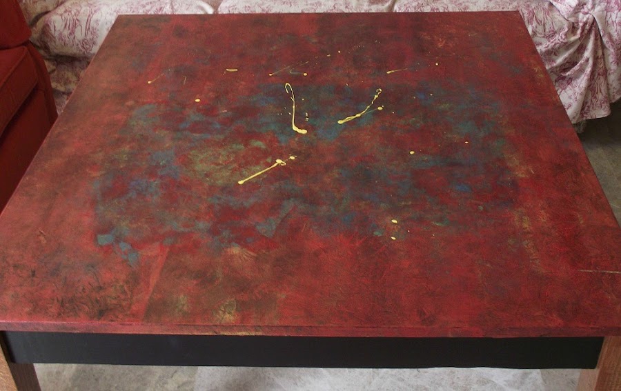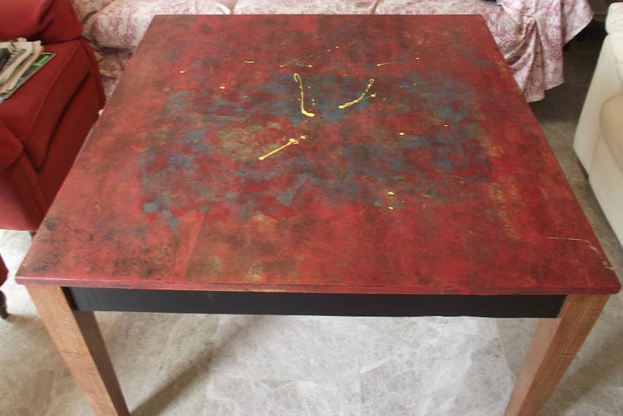 De base di una mano de pintura negra a todo. Los laterales los dejé así, en negro, y la encimera la pinté haciendo una mezcla de colores que me gusta mucho y que he utilizado en más ocasiones (en este taburete pinté las patas con esta técnica). Se trata de mezclar pintura de color rojo, amarillo, ocre... y al final ligeros toques de turquesa y verde, para imitar el óxido.