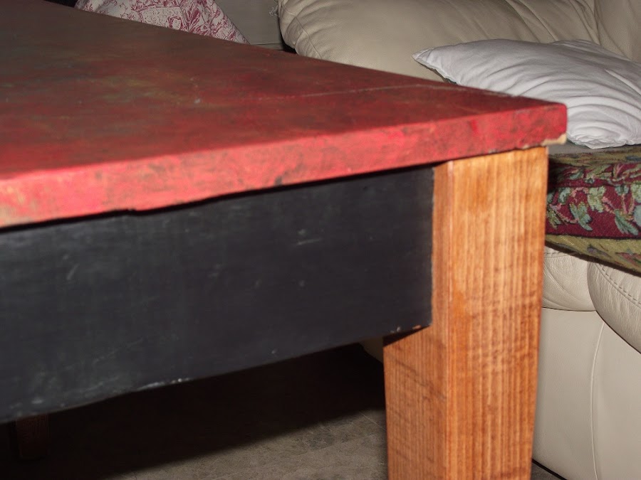 Un detalle de cómo quedan las esquinas con la combinación pintura negra-pintura roja-madera teñida: