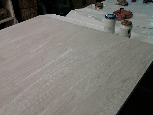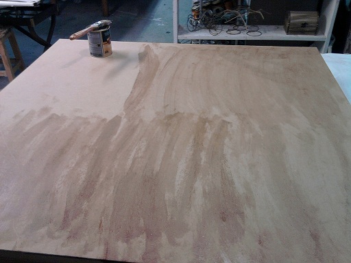 El trabajo en el tablero fue muy delicado, porque el DM es muy poroso y se estropea con la humedad. Era imprescindible dar una buena capa de tapaporos, para poder pintar, pero al mismo tiempo el tapaporos podía estropear la superficie del tablero si lo empapaba. La solución fue utilizar un tapaporos al disolvente e ir aplicándolo casi a pincel seco, una y otra vez, esperando a que se absorviera bien cada pasada, para que no se empapara. Al final conseguí tener todo el tablero protegido para poder pintar.