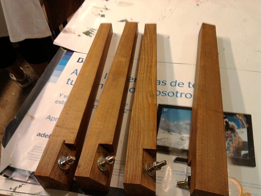 Las patas me las hicieron en madera de haya natural, sin ningún tratamiento, y con una altura de 60 cm, un poco más bajas que las de invierno. Las teñí en tono roble claro y luego dos manos de tapaporos para proteger de la limpieza.