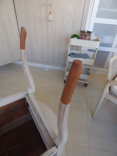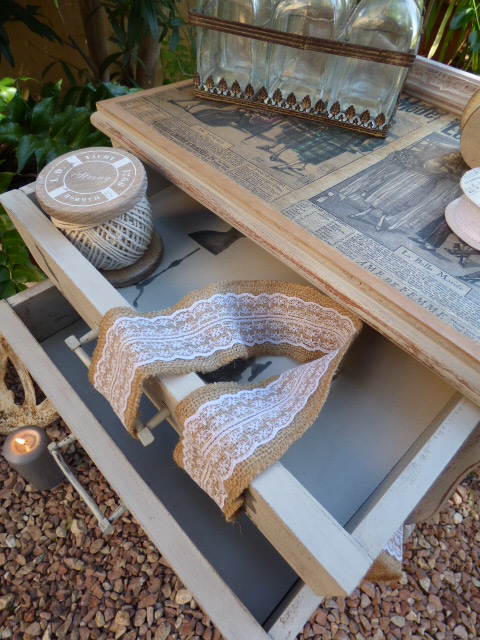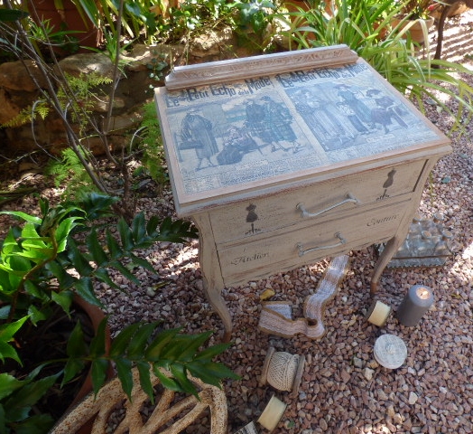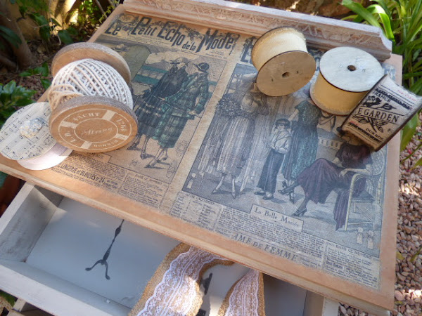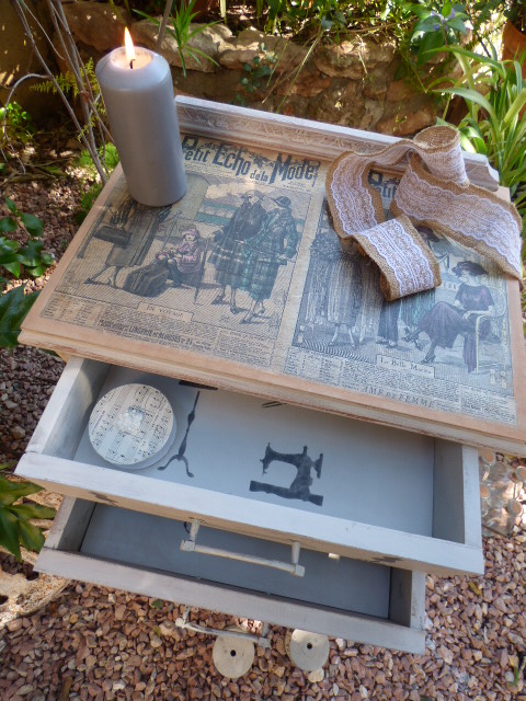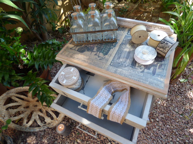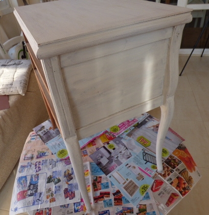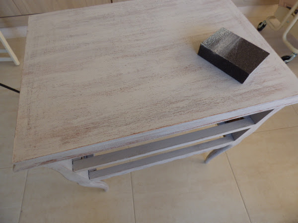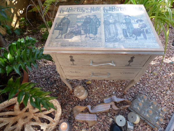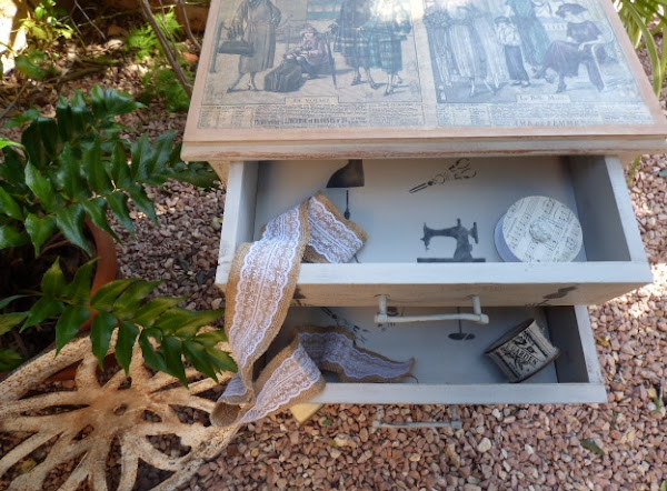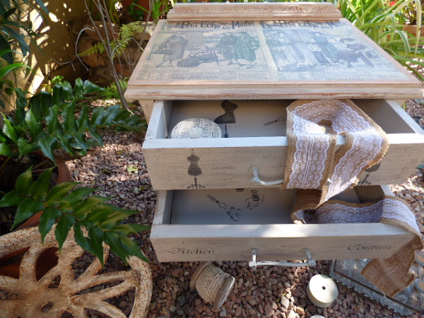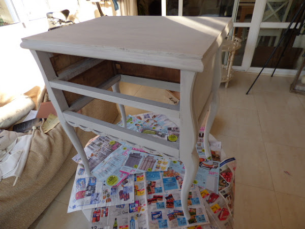 Hace un par de meses Esther, amiga de mi hermana Luisa, me encargó decorarle una mesita que había comprado en un rastro. Lo único que me dijo es que no fuera de color blanco, sino un tono gris o topo....y que la iba a usar como costurero. No tenía ninguna prisa en tenerla y aquí en mi casa ha estado un tiempo.....esta semana me puse con ella.