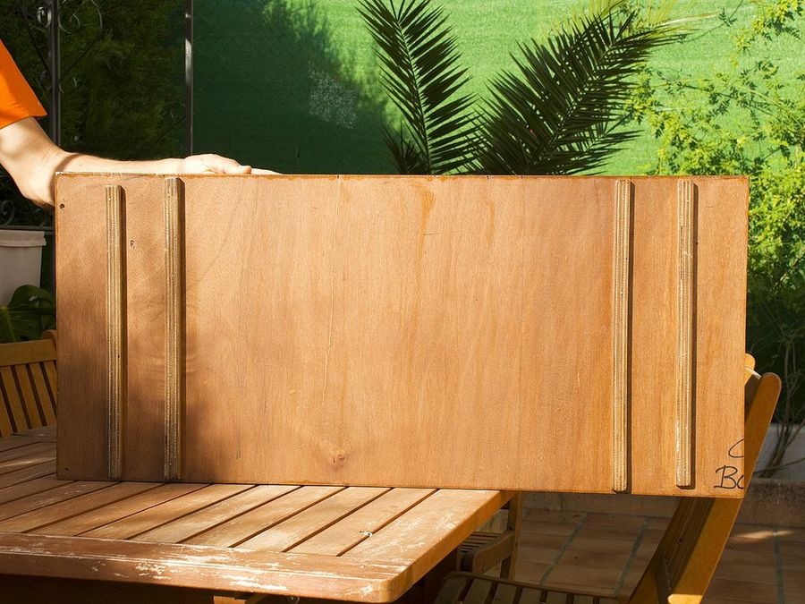 La segunda parte del mueble es la tapa, realizada con un tablero contrachapado también sobrante de montajes anteriores. Sus medidas determinaron la forma alargada de la mesa. Aquí vemos la parte inferior. Las guías de los extremos sirven para afianzar las patas, permitiendo a la vez un rápido desmontaje.