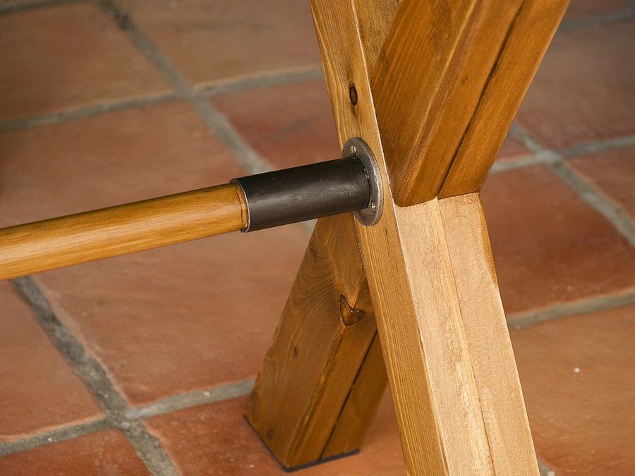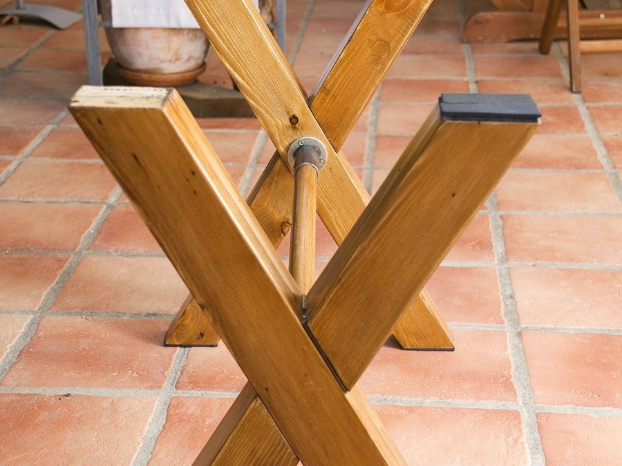 Vamos a desglosar la pieza para asimilar el proceso de fabricación. Las patas se han montado de una forma muy llamativa, en doble aspa. El listón central tiene funciones estructurales: es un elemento imprescindible de cualquier mesa para garantizar la solidez. En el taller había un palo redondo, sobrante de un montaje del verano anterior, que encontró por fin utilidad en este diseño.