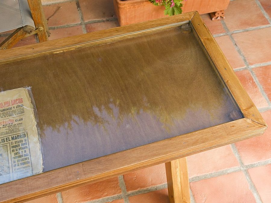 El cristal es el único ingrediente 'foráneo' de la mesa. Fue encargado a un almacén, y gracias a los apoyos de las esquinas queda un poco elevado, de forma que pueden colocarse debajo fotos, láminas, telas y otros objetos decorativos. El viejo diario deportivo que vemos es un ornamento muy revelador de las aficiones del autor de la mesa.