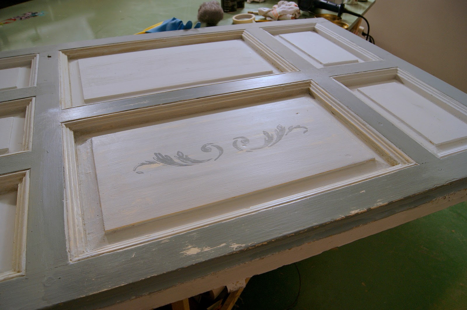 Elegimos un dibujo sencillo que estarcimos con color "metálico" en los cuadrantes grandes.