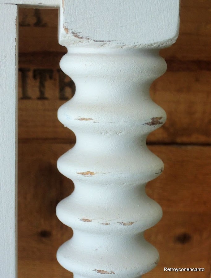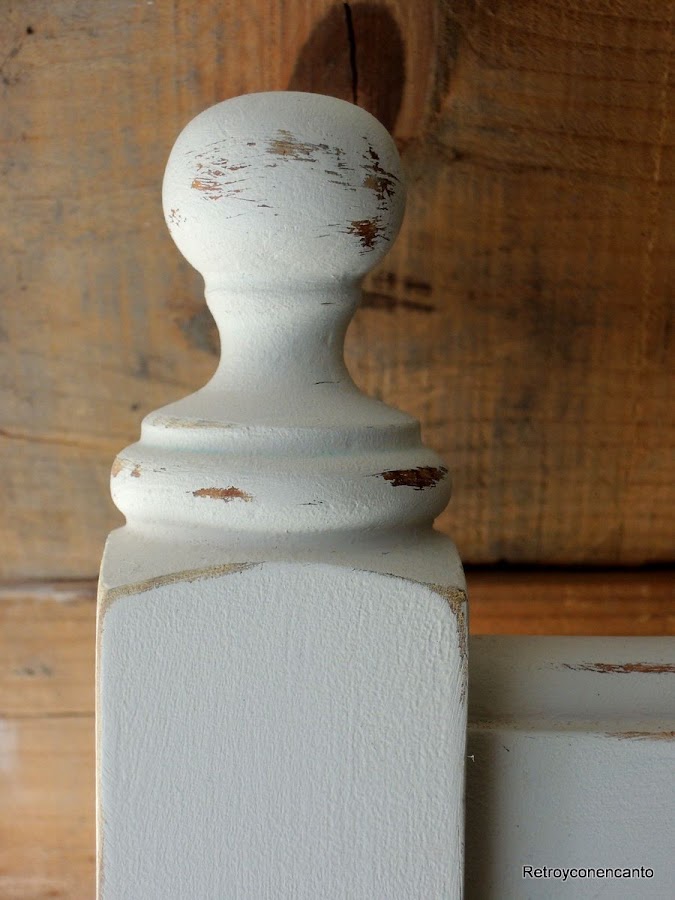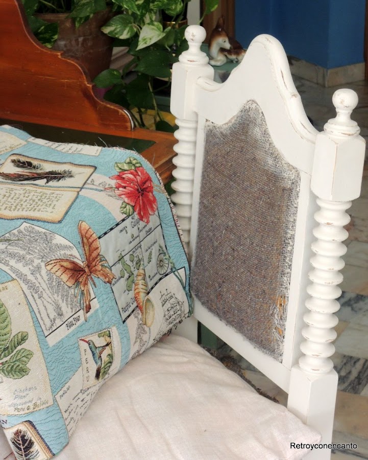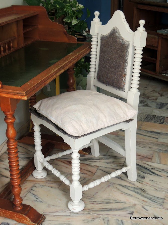 Como veréis, la silla es totalmente rústica. La clienta la quería pintada en un tono beig y decapada. Hemos empleado pintura a la tiza, y lijado previamente. No ha sido fácil con tanto torneadito..., pero así aseguramos un mejor agarre de la pintura. La tapicería no nos corresponde esta vez a nosotras. Y bien que lo agradecemos, pues hay que rehacer toda la estructura, desde las cinchas a la gomaespuma, y, aunque alguna vez lo hemos hecho, no es nuestra especialidad. Aquí podéis apreciar lo que cambia la silla pintada en su nuevo color. Realmente parece otra.