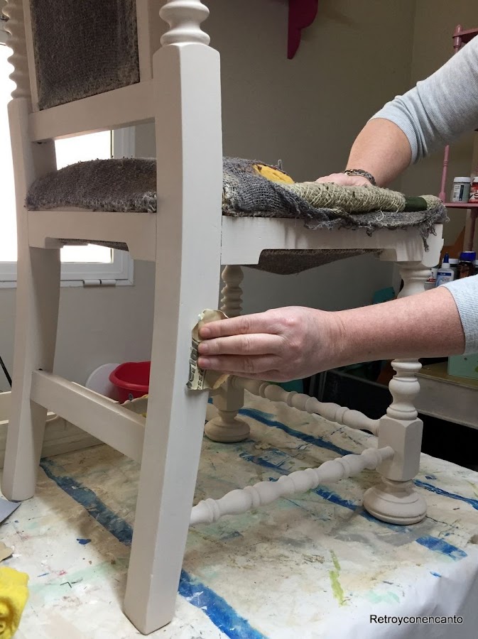 No os lo creeréis, pero la parte más bonita de este encargo ha sido lijar para envejecer. El estilo del asiento nos pedía un decapado un poco más exagerado que en sillas de otra estética más depurada o actual.