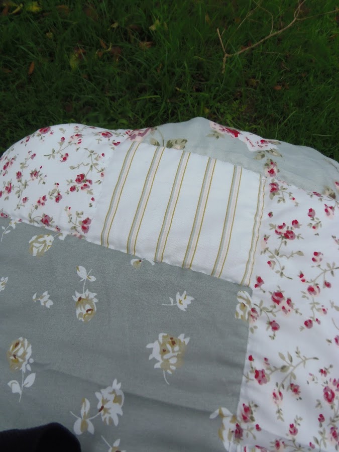 Pero encontré este retal y se me ocurrió forrarla con un relleno fino y una sábana e ir haciendo cosidos cómo si fuera un acolchado (las costureras estarán echando las manos a la cabeza jajaja)