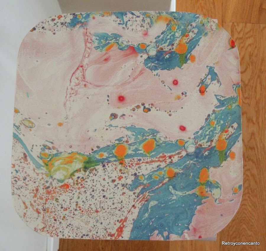 Y el papel elegido para hacer el decoupage (cuya foto sobre el proceso hemos borrado tan ricamente...). Su dibujo, que no sabemos muy bien cómo definir, nos enamoró nada más verlo, y tuvimos claro que iba a ser el protagonista de nuestra telefonera.