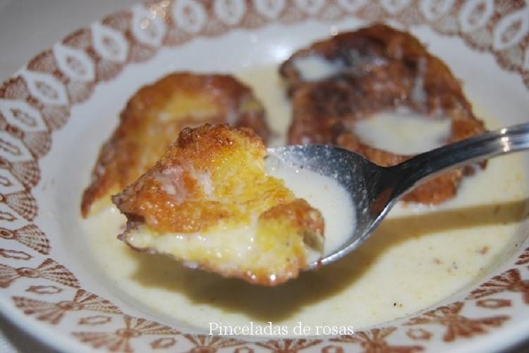Otra manera de comerlas es con más cantidad leche, ponemos las torrijas en un plato más profundo, cubrimos con la leche infusionada y así la podemos comer con cuchara, seguro que para los más pequeños es más fácil de comer.