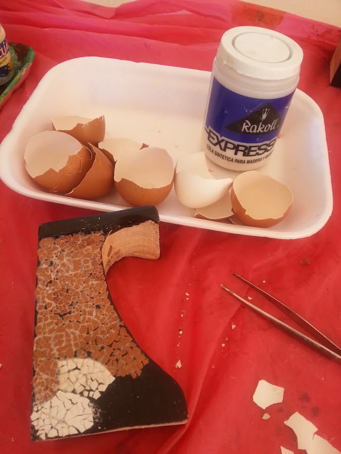 Con el pegamento que se ve en la foto, fuí pegando cuidadosamente las cascaras de huevo.