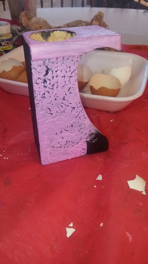 Primero pinté de negro, pensando que solo con pegar las cascaras de huevo se vería el fondo, pero como no todos los trabajos salen como queremos a la primera. Recurrí a mi amiga Amparo del blog EL RINCÓN DE LAS MANUALIDADES CASERAS, y me recomendó que mejor pintar todo rosa y luego hacer una aguada sobre el rosa y así lograría ese fondo negro, que yo quería represetar, superado la obscura etapa.