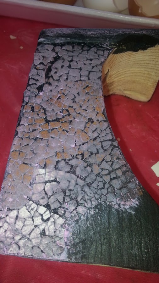 Siguiendo los pasos de mi amiga Amparo le di una aguada de color negro, que luego retiraba con un paño, logrando así quedara el negro entre las cascaras de huevo.