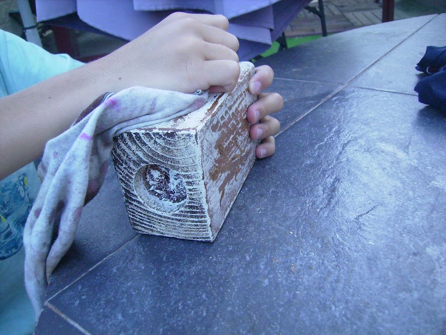 Una vez el tinte está bien seco, se frota con estropajo de esparto para cerrar el poro de la madera.