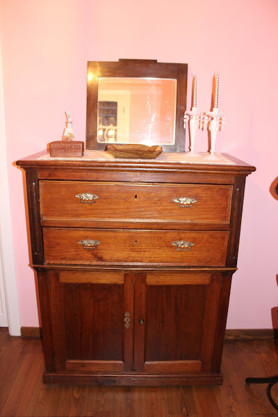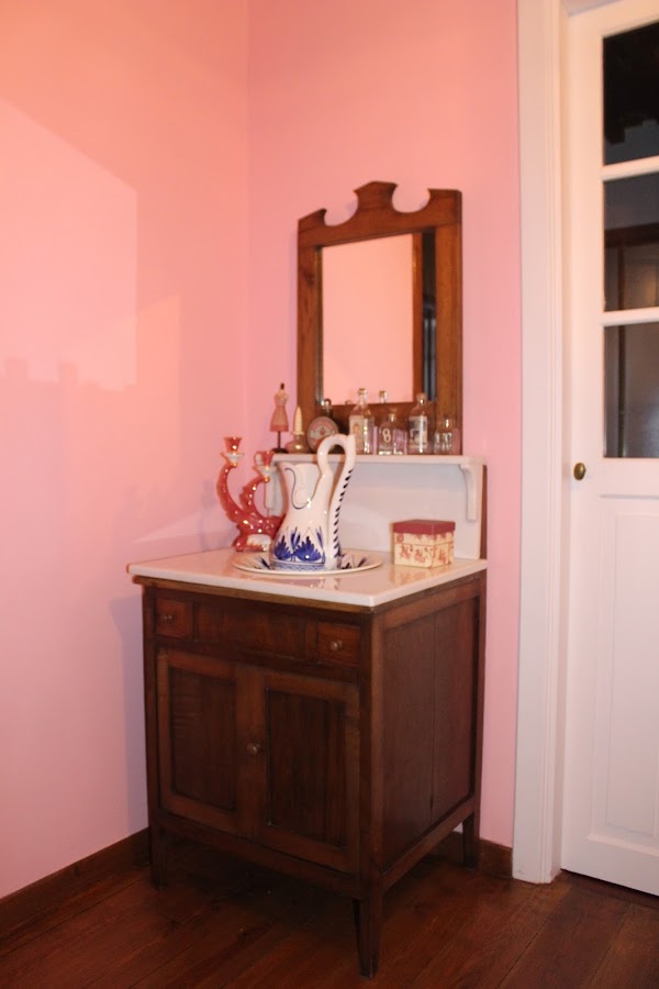En otro rincón hay un lavabo antiguo que estaba en la casa. Fue mi primer trabajo de restauración. El espejo lo encontré en el montón de cosas viejas y maderas que iban a ser convertidas en leña. Le puse un mármol nuevo y le compré una palangana y una jarra.