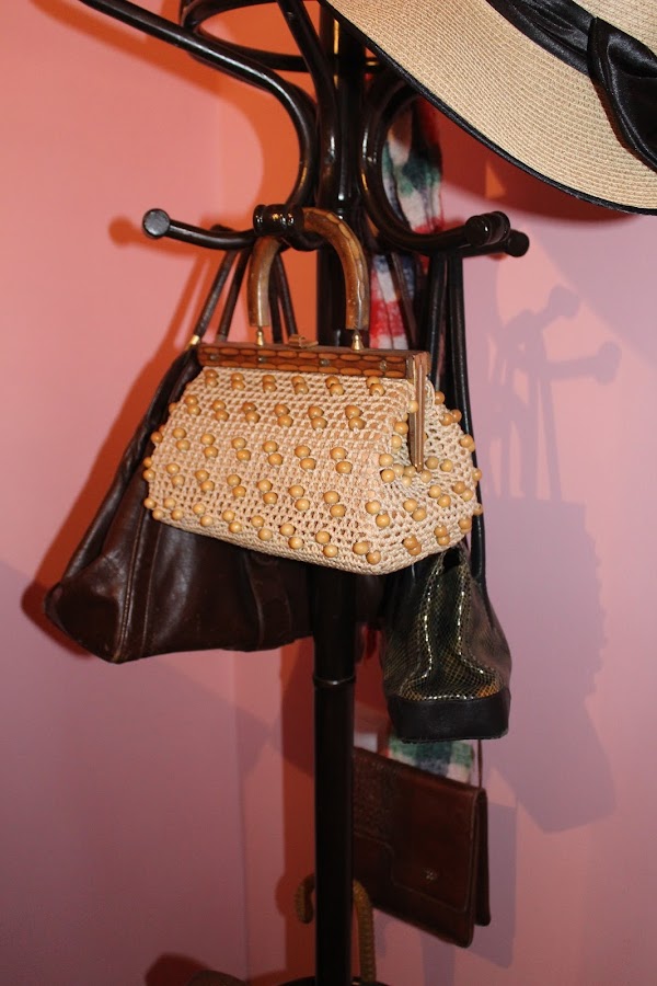 El perchero alberga mi colección de bolsos de distintas épocas (todos son antiguos, años 60, 70 y 80).