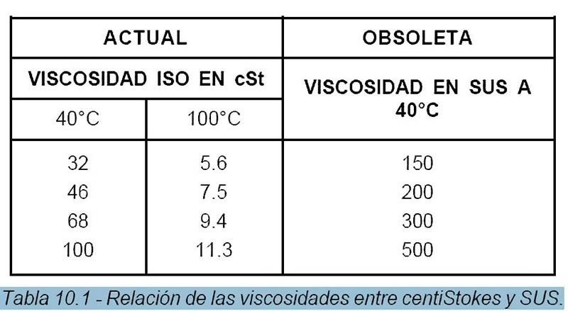 Organization), ha determinado que la viscosidad de los aceites industriales, se exprese en centiStokes a una temperatura de 40°C. Sin embargo, algunos fabricantes de aceites aún utilizan las unidades en SUS. En la tabla 10.1 se muestra una comparación de los valores de las viscosidades en centiStokes y en SUS.