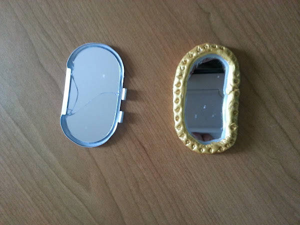 El espejo que va encima de la cómoda pegado a la pared, es un espejo viejo de bolsillo, del que tomo una parte, le pego pasta de papel, que esta cuando seca queda dura. Mientras está blanda le hago unos agujeros a modo de decoración, y luego le pinto con un acrílico, oro viejo.