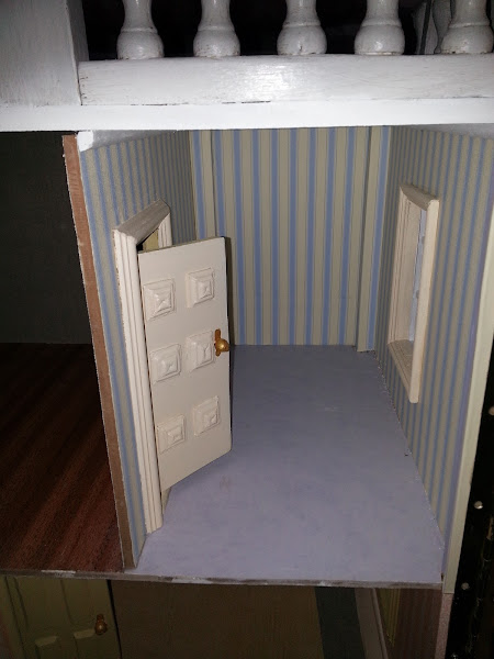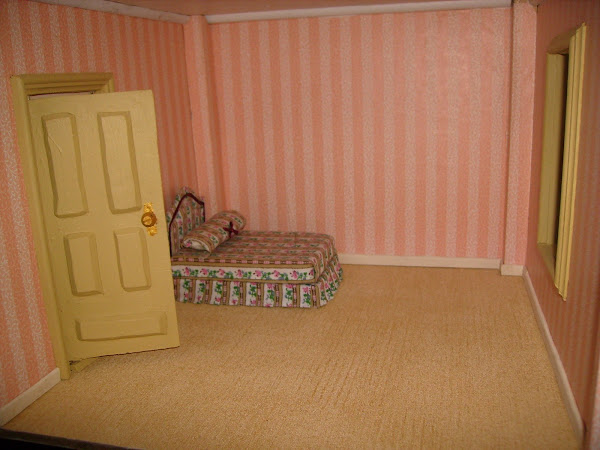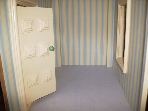 Al igual que en las estancias anteriores, hago las molduras de las ventanas y la puerta. Las paredes las forro con papel de empapelar y el suelo también. Luego con los palos de los helados pongo un rodapie a todo alrededor del suelo.