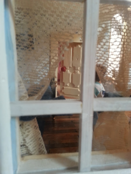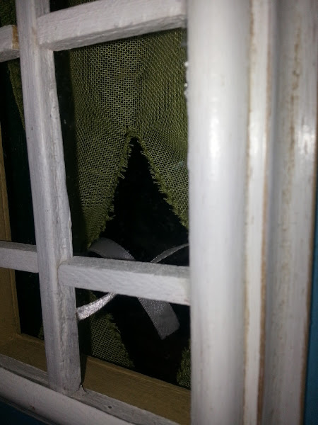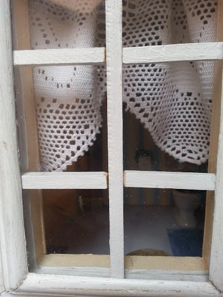 Las cortinas son un resto de una puntilla, y le paso un palo redondo y a los extremos le pego unas maderitas a las que las hago un agujero para que inserte el palo, que soporta las cortinas. Luego lo pego con pegamento fuerte.