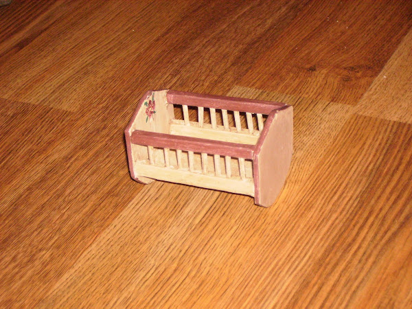 Esta cuna también la hice yo desde cero, utilicé para los barrotes palos de madera de los de hacer las brochetas, a las maderas donde van fijados les di unos pequeños taladros pegando con pegamento fuerte después dichos palitos cortados.