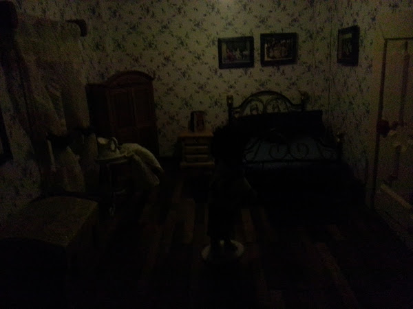 Foto desde el exterior de la ventana de la habitación verde, en la obscuridad de la noche.