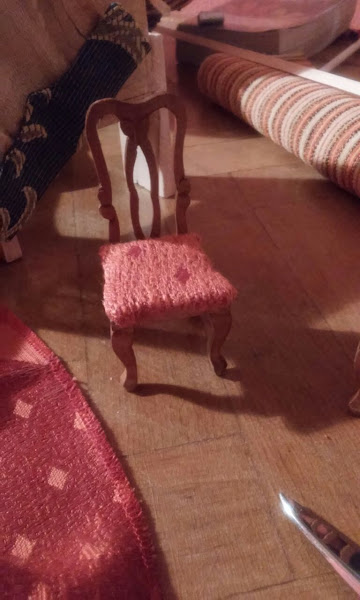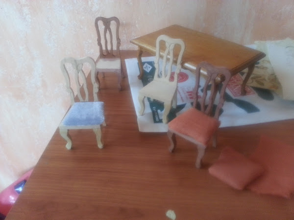 Las sillas para el salón al igual que la mesa, son compradas. Pero como no me gustaba el tapizado que traía las sillas, con un retal las corto y las tapizo.