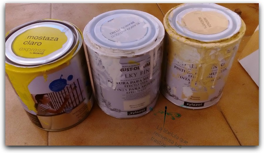 Las pinturas elegidas fueron un blanco antiguo y mostaza, de pintura a la tiza; y mostaza claro mate, este un esmalte que también se aplica directamente sobre la madera, sin lijar ni imprimar, y es un color que me encantaaaaa...