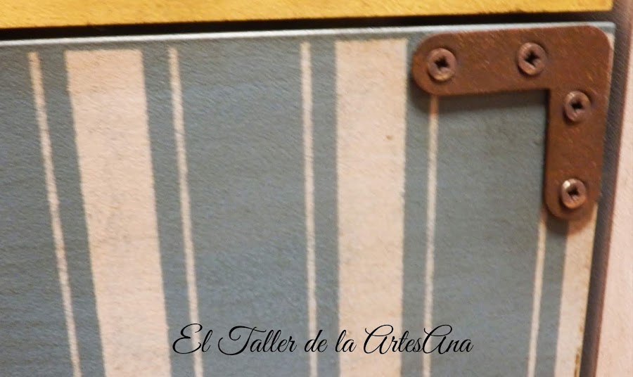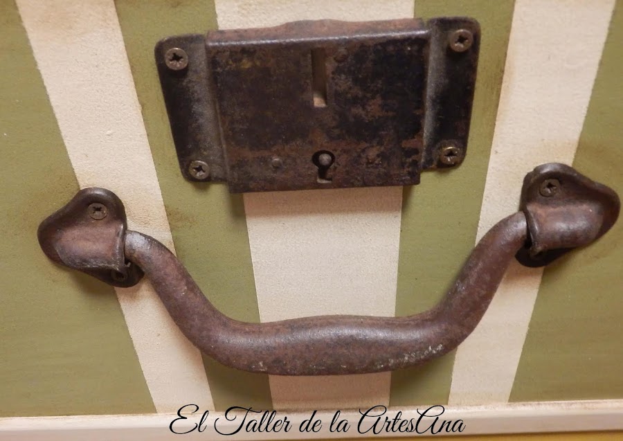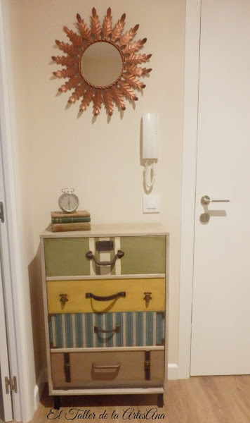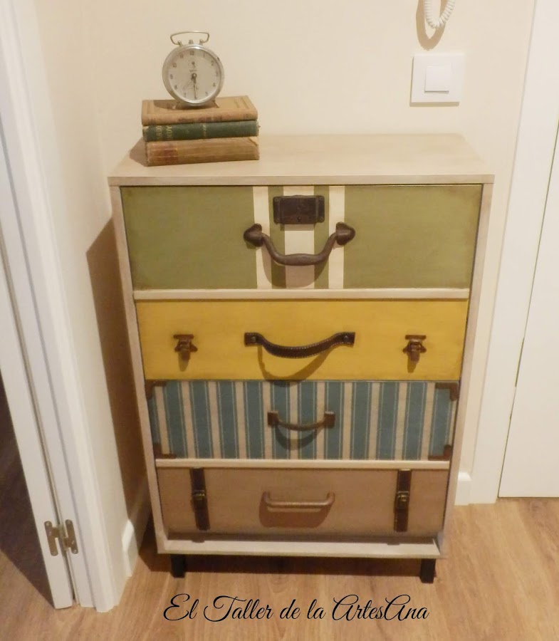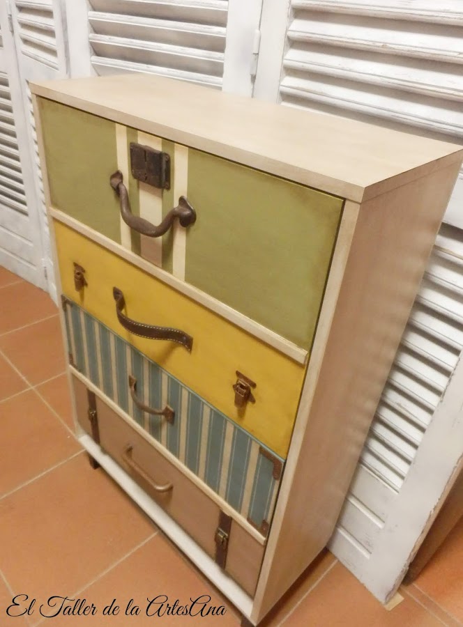 Y así es como quedó tras pasar por mis manos... Utilicé todos los colores, como no, de Mary Paint: Arena tostada para la estructura y Verde Oliva, Mostaza, Azul Nórdico y Azucar Moreno para los cajones. Como tiene dos puertas anchas, para simular las maletas puse unos listones de dm en el medio de cada cajón. Dos de los cajones tienen stencil de rayas. El azul hecho con plantilla y el verde con cinta de carrocero.