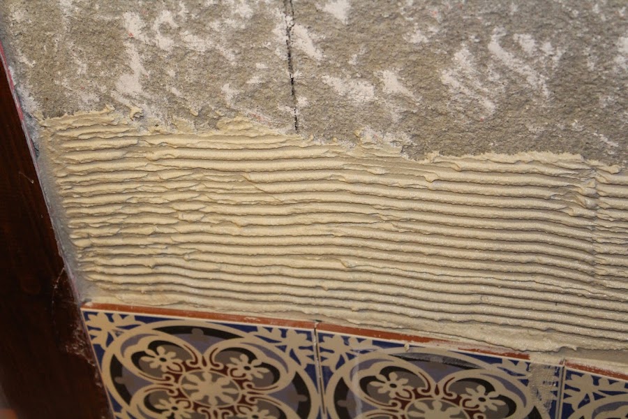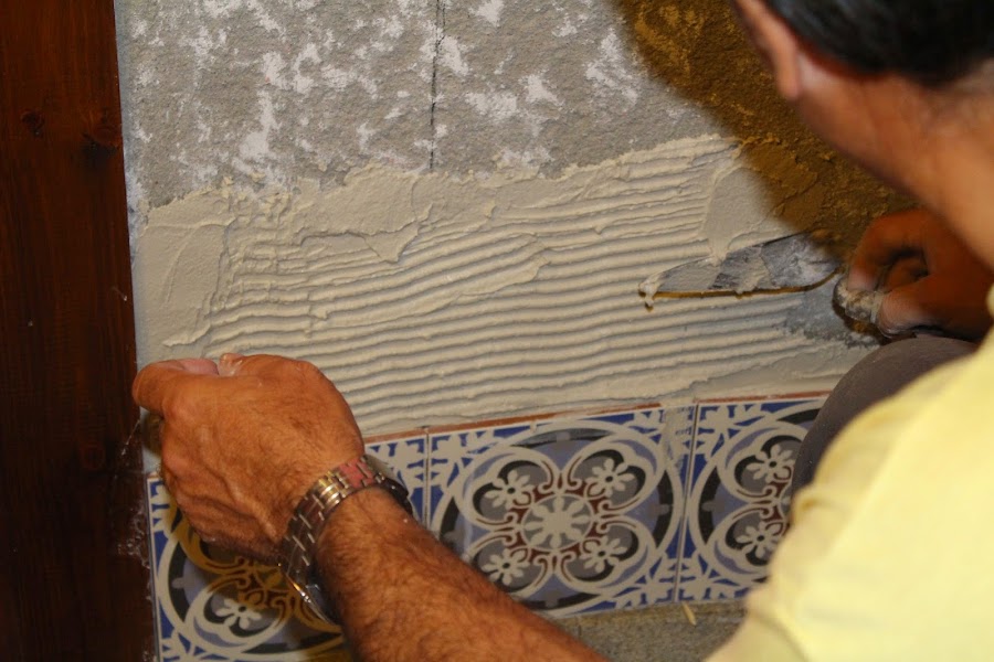 Mi marido primero picó el enlucido, luego con masa-cola fue colocando las baldosas.